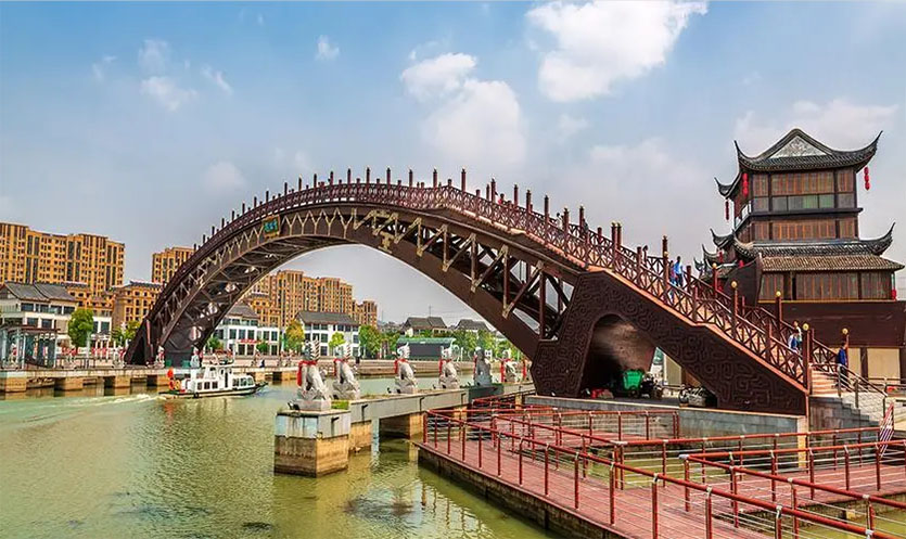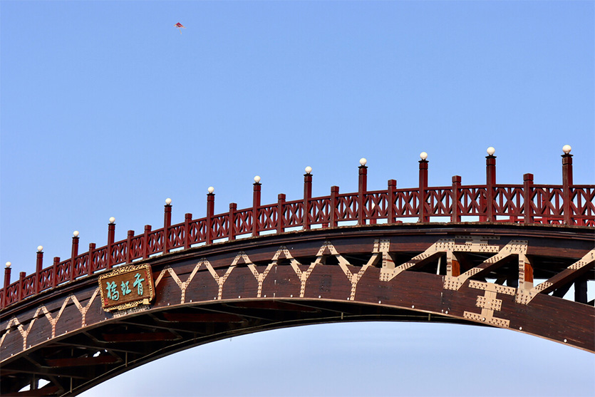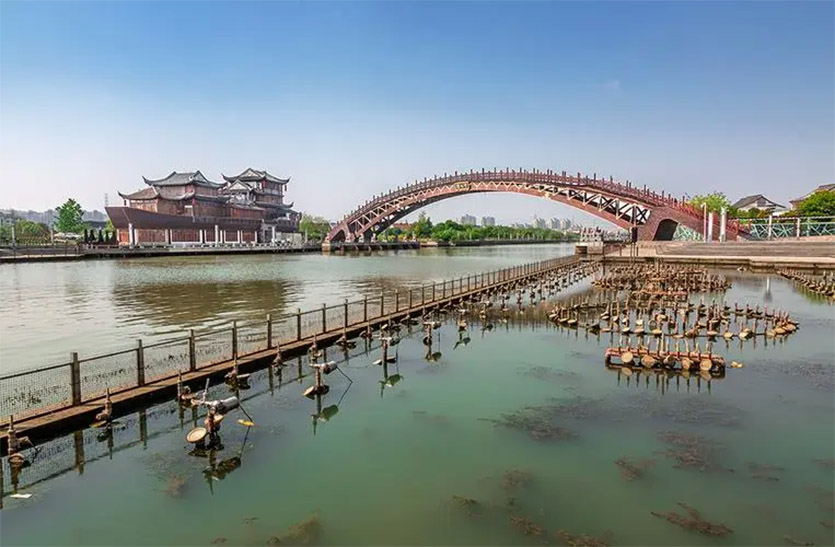 一直以來談及拱橋,人們多停留在舊時(shí)石質(zhì)結(jié)構(gòu)的趙州橋、盧溝橋等,或是融人現(xiàn)代鋼筋混凝土工藝的長沙湘江大橋、涪陵烏江大橋……木拱橋似乎鮮有存在感,當(dāng)然,這與木材不耐重壓、腐蝕有著脫不開的關(guān)系。但是隨著時(shí)代工藝的發(fā)展,當(dāng)精選木料配以特殊的處理方式擺脫一般木材易腐蝕、變形的缺點(diǎn),在疍江大橋東一箭之地,胥口青虹橋也在世界橋梁史上擁有了響當(dāng)當(dāng)?shù)拿?hào)一一世界最大單跨的木拱形橋。